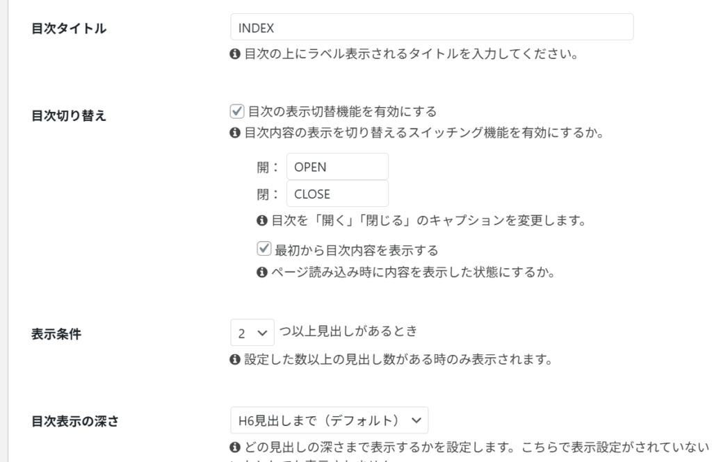目次関連のその他の設定についても、Cocoon設定内の「目次」タブから変更が可能です。