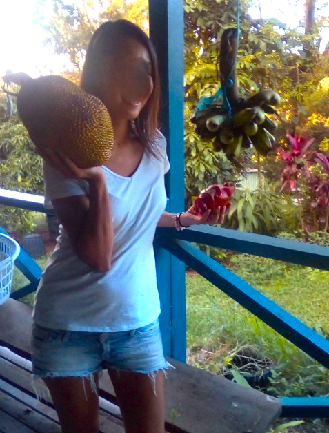 右手にジャックフルーツ、左手にドラゴンフルーツ、そして取ったばかりの吊るしたバナナです。